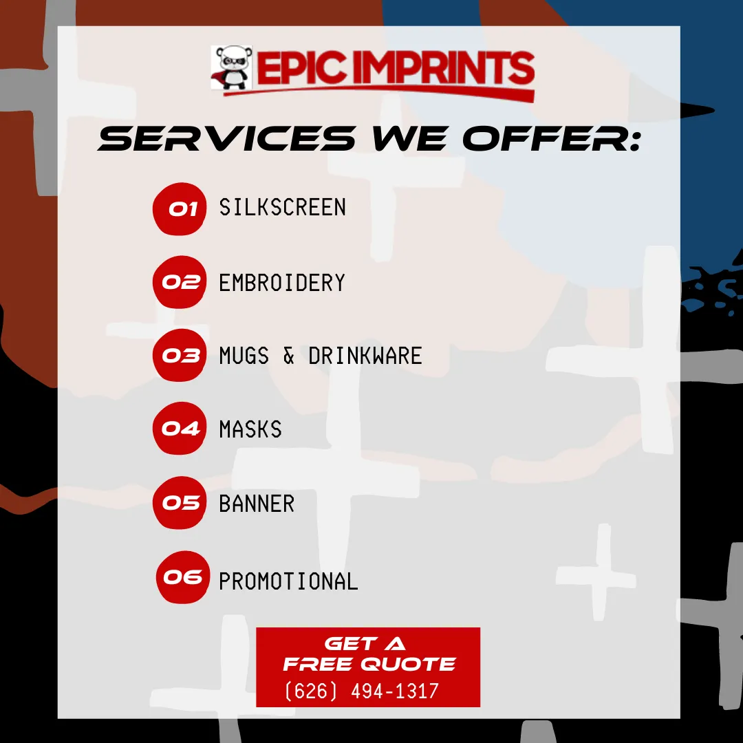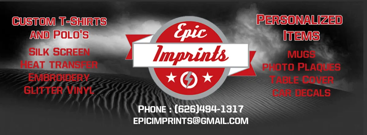Mission: Epic Imprints is a Printing Company that serves Los Angeles, Orange County, Inland Empire, San Bernardino, Riverside, and Covina. We specialize in custom silkscreen printing, embroidery, and clothing and apparel every day and have received awards for and Heat Transfer Vinyl and Custom T-Shirt Printing We are located near the Sea Ocean Seafood and Tacos Los Desvelados West Covina. We offer Custom silkscreen printing to Baldwin Park, CA.
